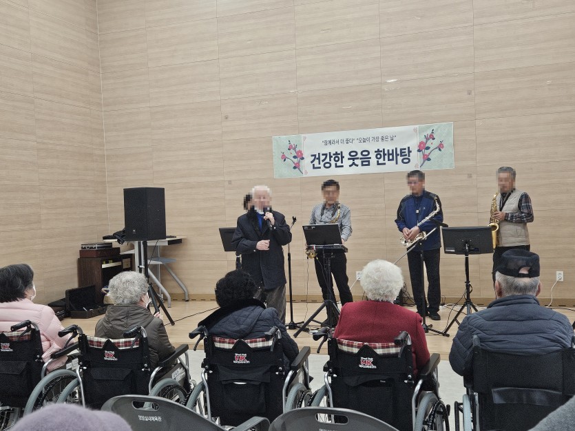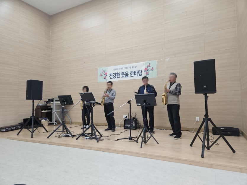 색소폰동호회 분들이 오셔서 어르신들을 위해 공연을 해주셨습니다. 어르신들도 함께 나오셔서 노래도 부르시고 즐거운 색소폰 공연도 관람하시고